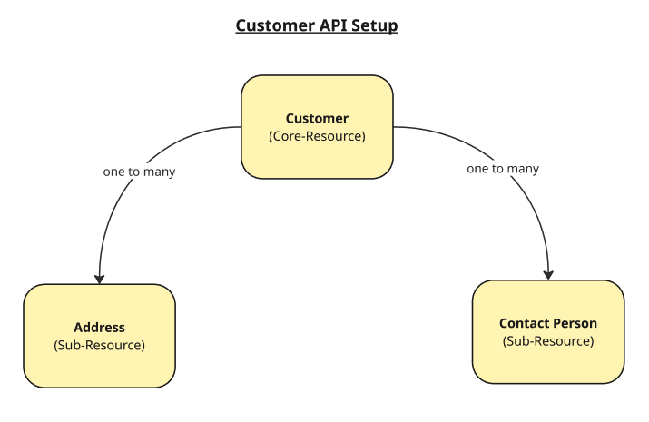 The customer API setup is build around a top-level customer resource and independent sub-resources for addresses and contact person. The core resource has a one-to-many relationship with its sub-resources. Thus, a customer can have many addresses (e.g. billing, shipping) and many contact person (e.g. sales rep, support agent).
